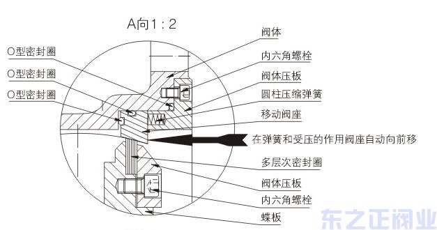 4、  自動補償雙向壓:(請見圖三)按圖從左往右施壓時,利用三偏心的原理,蝶板與閥體越關(guān)越緊,從而得到良好的密封;按圖從右往左施壓時,移動閥座在受壓力的推力和彈簧推力時,移動閥座自動向蝶板推緊,當(dāng)壓力越高移動閥座向蝶板越推越緊,從而得到良好的密封;因此本閥屬于雙向金屬硬密封蝶閥蝶,雙向壓也能達到100%的零泄漏;在長期的使用下,移動閥座密封和蝶板密封如有磨損或損傷,在彈簧作用下移動閥座自動向蝶板推進,在反向受壓時蝶板會向箭頭移動,這時則移動閥座在彈簧和壓力的作用它也會跟著前移,從而得到良好的自動補償功能。